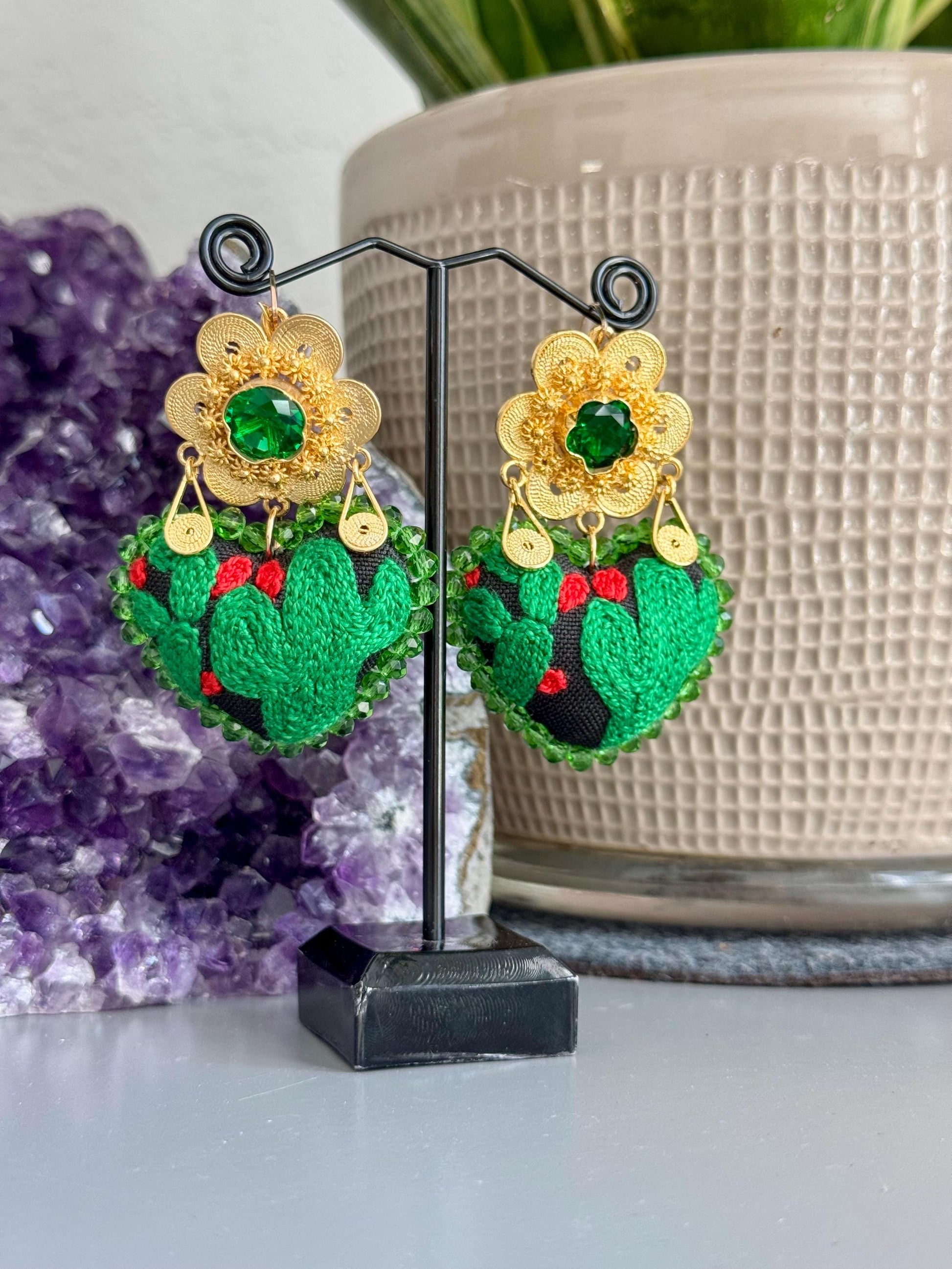 Embroidered Heart Earrings, Traditional Mexican Earrings, Cactus Earrings, Artesania Mexicana