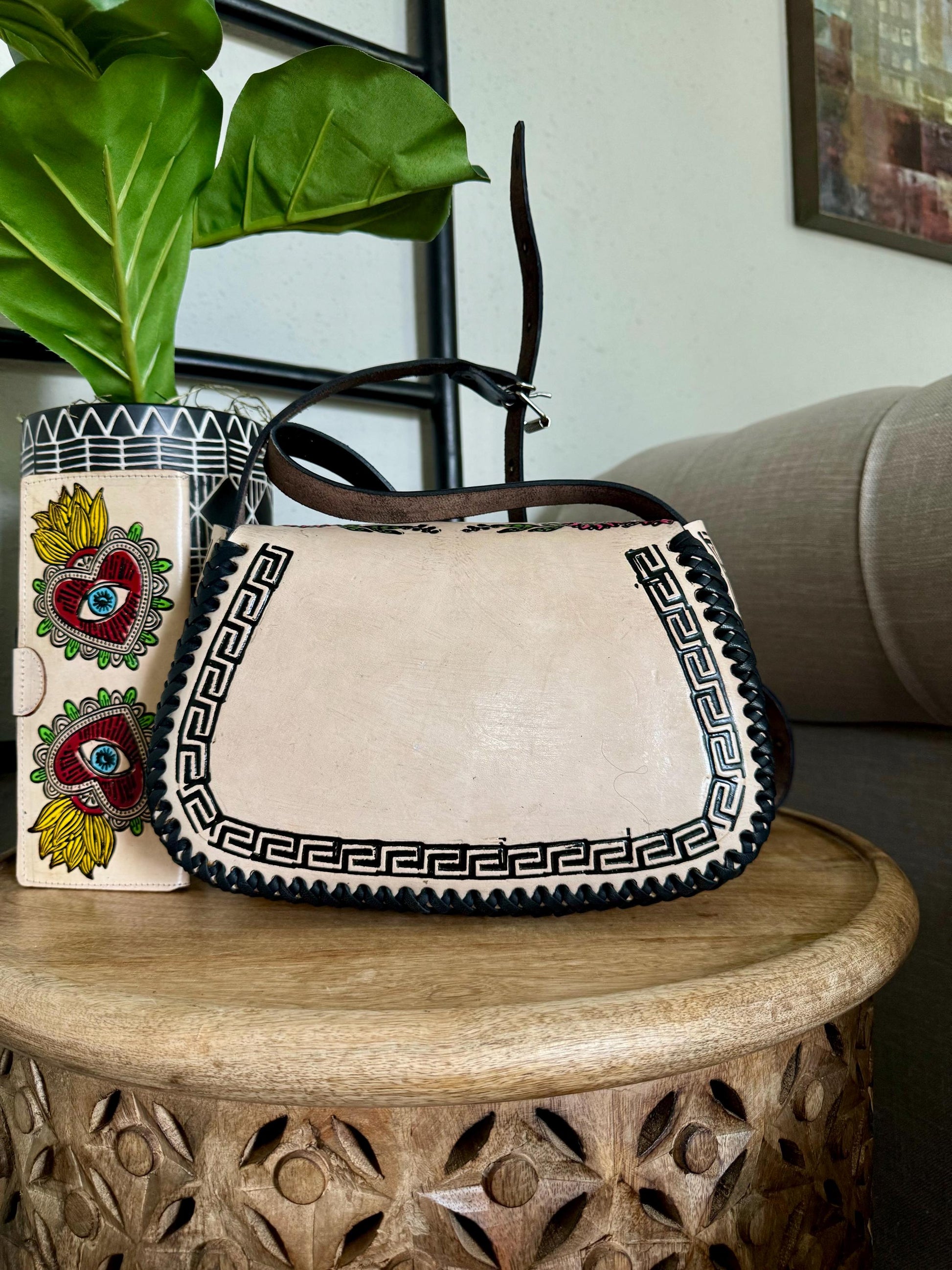Hand-Tooled Embossed Mexican Leather Floral Purse and Wallet Set, Evil Eye Handmade Leather handbag, Hand painted Mal De Ojo, Artesanal