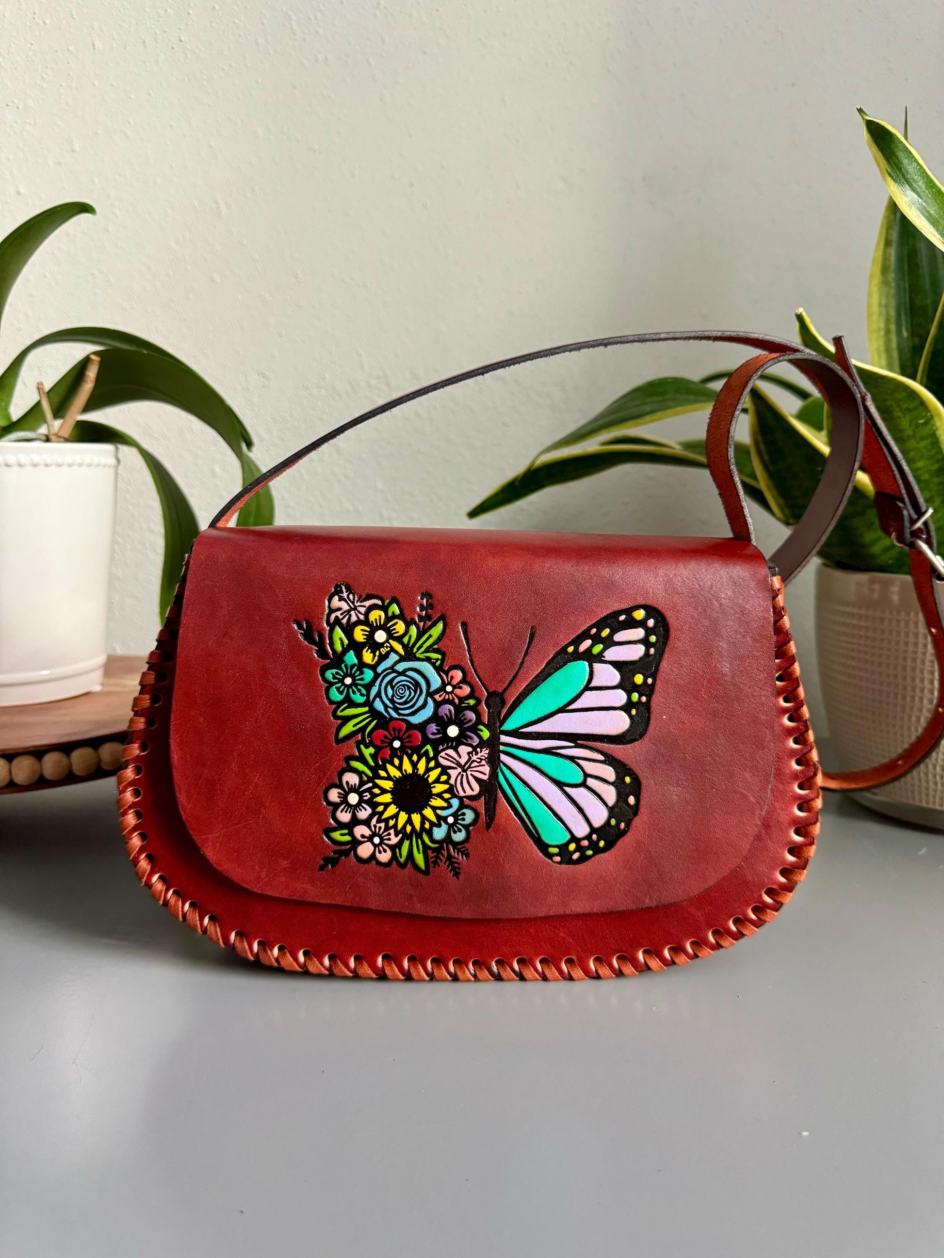 Leather Hand-Tooled Embossed Mexican Floral Handbag, Handmade Butterfly Sunflower Motif Purse, Artesanal Bag